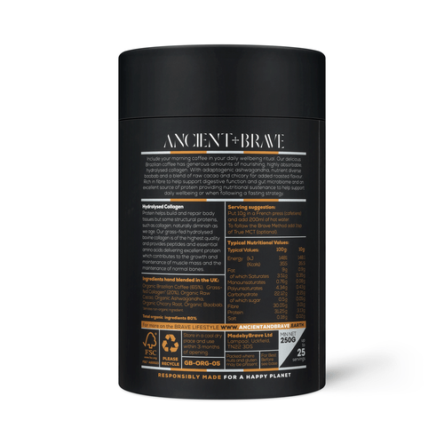Café orgánico brasileño, colágeno bovino alimentado con pasto (20%), cacao crudo orgánico, ginseng siberiano orgánico, diente de león orgánico, baobab orgánico.